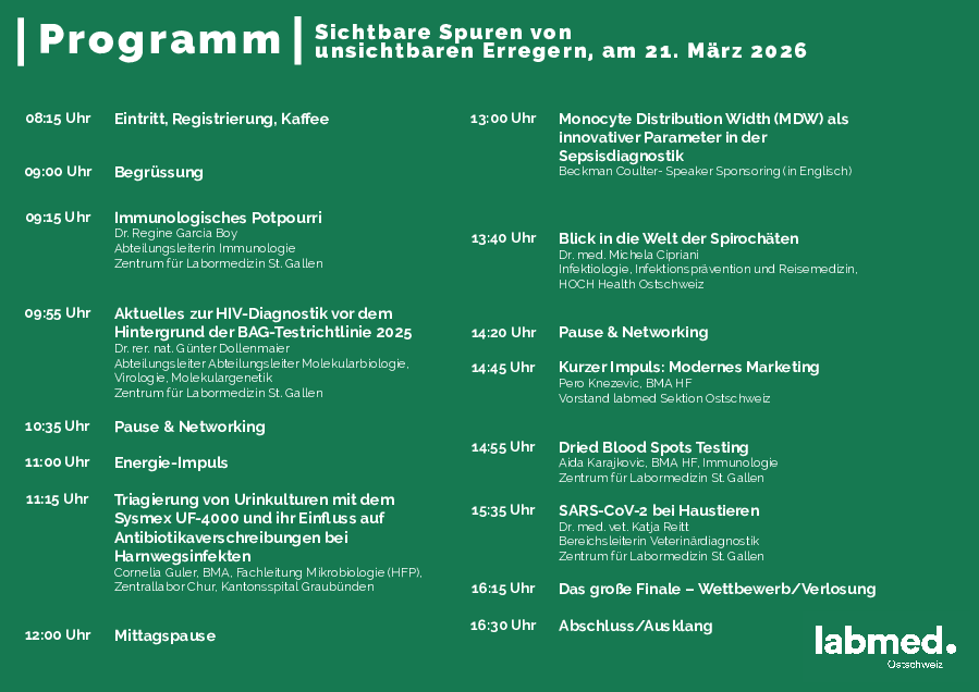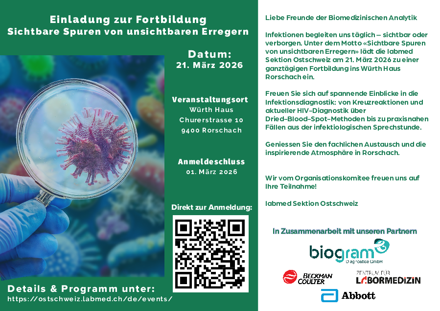 Infektionen begleiten uns täglich – sichtbar oder verborgen. Unter dem Motto «Sichtbare Spuren von unsichtbaren Erregern» lädt die labmed Sektion Ostschweiz am 21. März 2026 zu einer ganztägigen Fortbildung ins Würth Haus Rorschach ein.