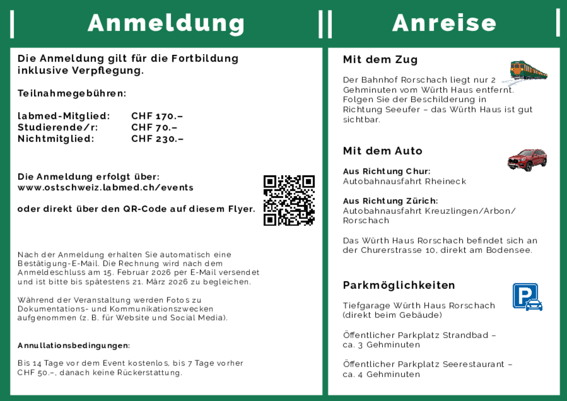 Freuen Sie sich auf spannende Einblicke in die Infektionsdiagnostik: von Kreuzreaktionen und aktueller HIV-Diagnostik über Dried-Blood-Spot-Methoden bis zu praxisnahen Fällen aus der infektiologischen Sprechstunde. Geniessen Sie den fachlichen Austausch und die inspirierende Atmosphäre in Rorschach.